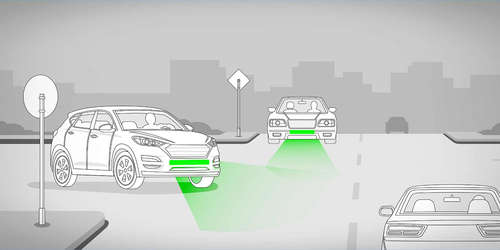 De grønne bremselys tændes, når bilen bremser, og slukker, når den holder stille og er klar til at køre igen. Det giver både modkørende og trafikanter fra siden en visuel advarsel: Pas på, her sker der noget.