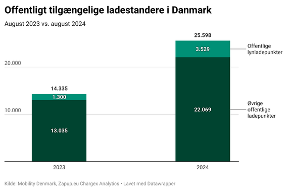 Elbilister har aldrig haft nemmere ved at finde offentlige ladepunkter. Med udgangen af august blev der sat endnu en milepæl, da antallet rundede 25.000. For et år siden, i august 2023, fandtes der kun 14.235 ladepunkter. Det betyder, at antallet er steget med godt 11.000 – hele 80 procent.